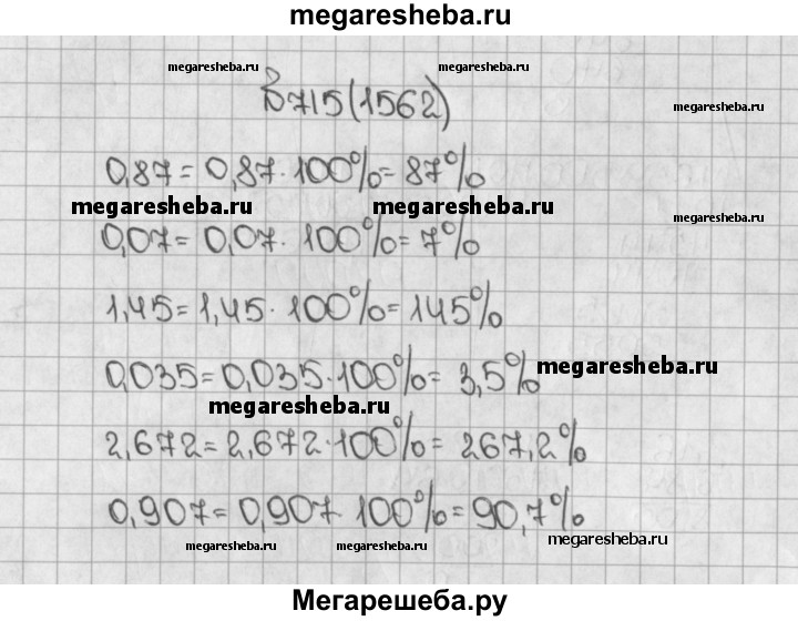 1562. Запишите в процентах десятичные дроби: 0,87; 0,07; 1,45; 0,035; 2,672; 0,907.