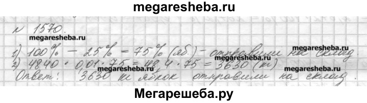 1570. В плодовом саду собирали яблоки. За день было собрано 4840 кг. 25% собранных яблок отправили в магазин, а остальные — на склад. Сколько килограммов яблок отправили на склад?