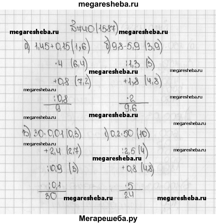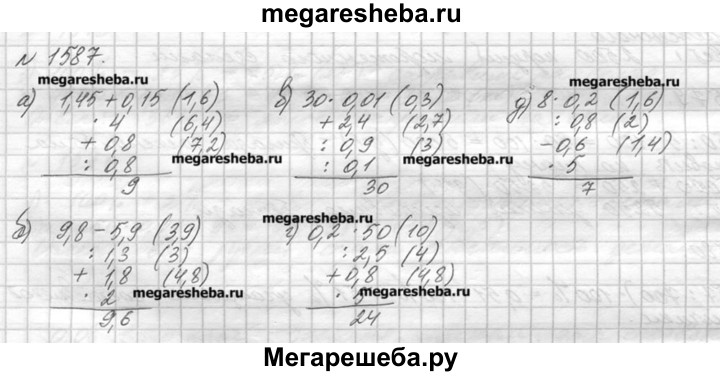 1587. Вычислите устно: а)1,45 + 0,15* 4+ 0,8: 0,8/? б)9,8 - 5,9: 1,3+ 1,8* 2/? в) 30-0,01 +2,4 : 0,9 : 0,1/? г) 0,2 * 50: 2,5+0,8* 5/? д) 8-0,2: 0,8- 0,6*5/?