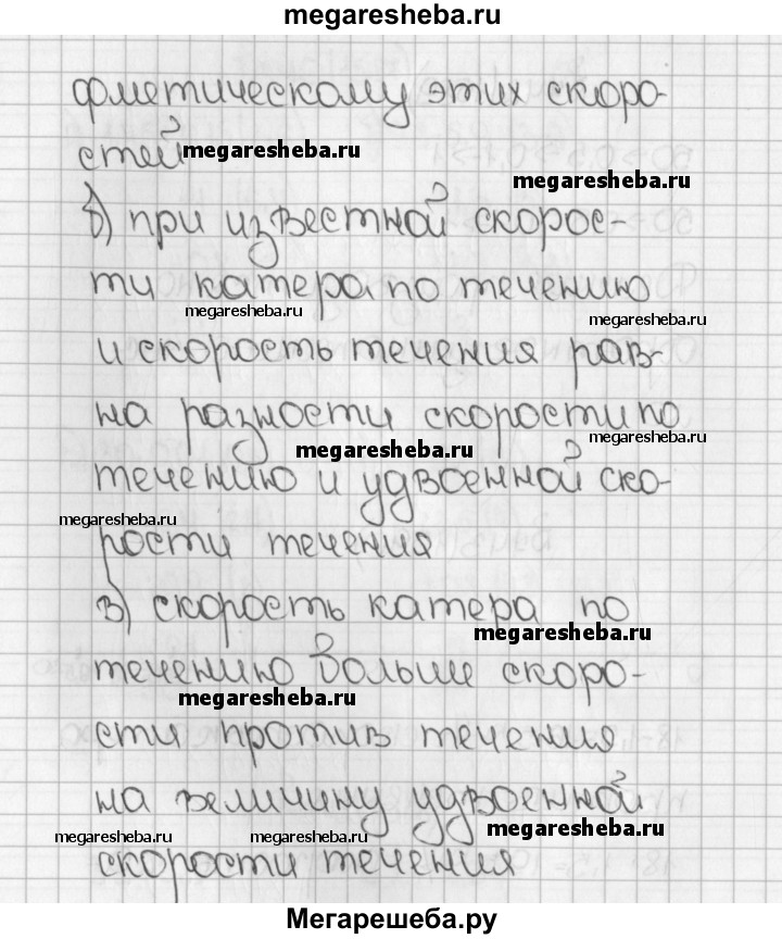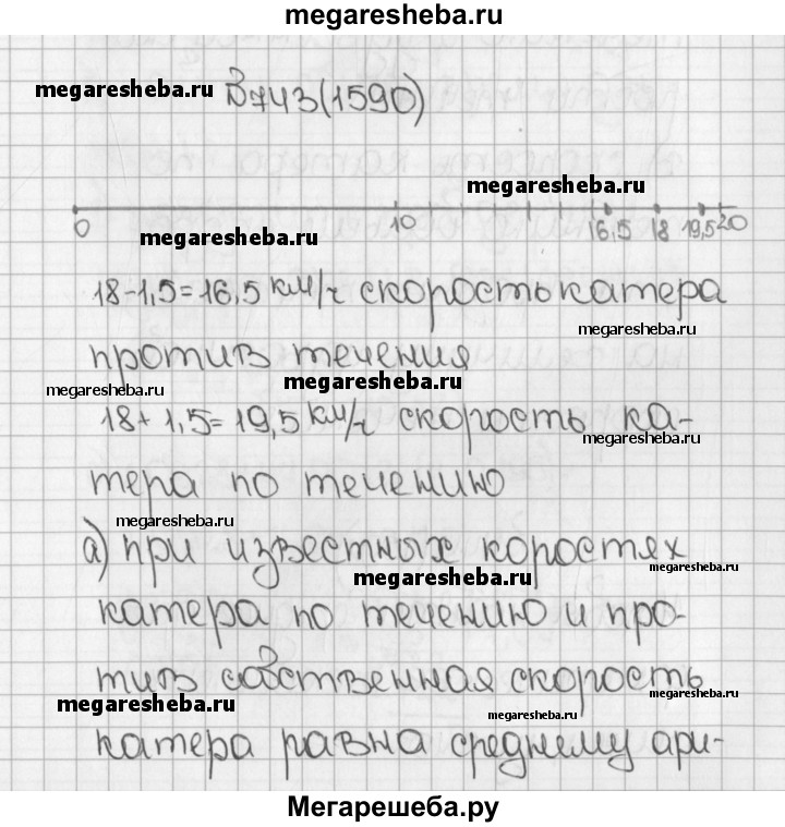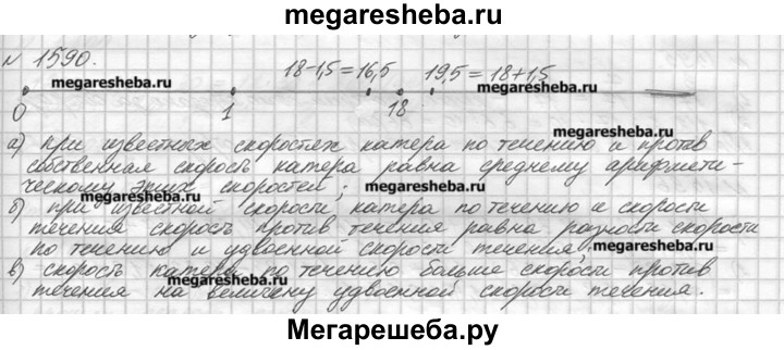 1590. Собственная скорость катера 18 км/ч. Отметьте её на координатном луче. Вычислите и отметьте на этом луче скорости катера против течения и по течению, если скорость течения 1,5 км/ч. Используя чертёж, подумайте: а)как найти собственную скорость катера, если известны его скорости по течению и против течения; б)как найти скорость катера против течения, если известны скорость течения и скорость катера по течению; в)на сколько скорость катера по течению больше его скорости против течения?
