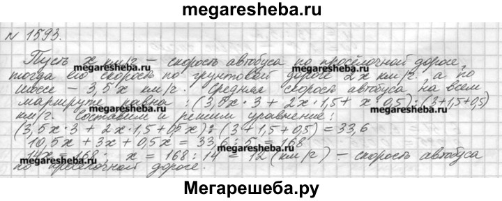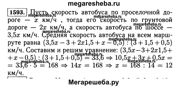 1593. Автобус шёл 3 ч по шоссе, 1,5 ч по грунтовой дороге и 0,5 ч по просёлочной дороге. Известно, что скорость автобуса по грунтовой дороге была в 2 раза больше скорости по просёлочной дороге, а скорость по шоссе в 3,5 раза больше скорости по просёлочной дороге. Найдите скорость движения автобуса по просёлочной дороге, если средняя скорость автобуса на всём пути 33,6 км/ч.