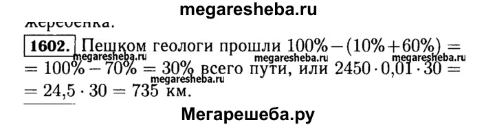 1602. Геологи проделали путь длиной 2450 км. 10% пути они пролетели на самолёте, 60% пути проплыли в лодках, а остальную часть прошли пешком. Сколько километров геологи прошли пешком?