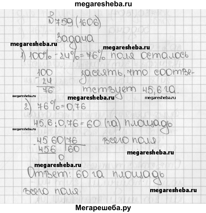 1606. Засеяли 24% поля. Осталось засеять 45,6 га этого поля. Найдите площадь всего поля.