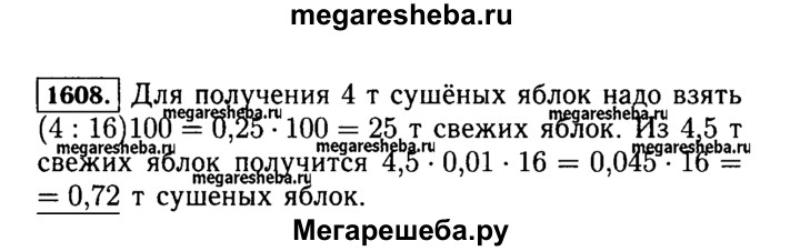 1608. Масса сушёных яблок составляет 16% массы свежих яблок. Сколько надо взять свежих яблок, чтобы получить 4 т сушёных? Сколько сушёных яблок получится из 4,5 т свежих яблок?
