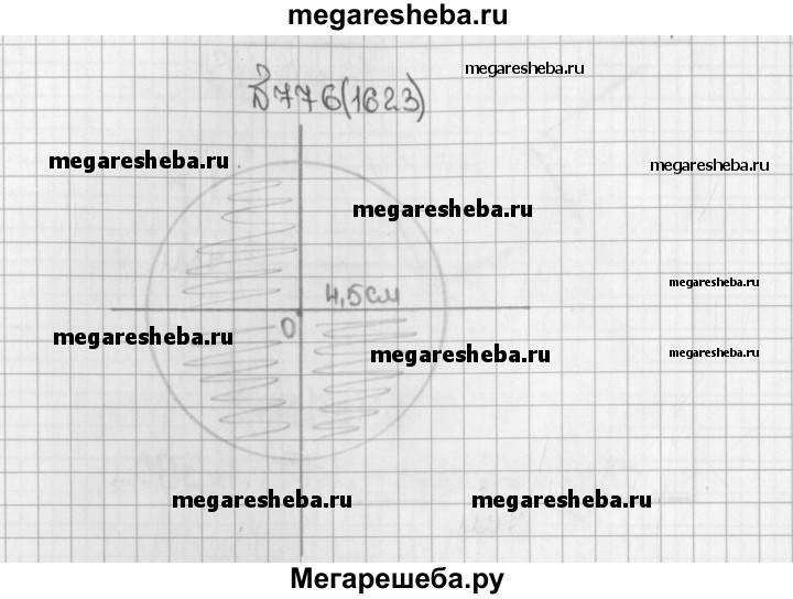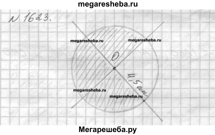 1623. Начертите круг с центром О и радиусом 4,5 см. Разделите круг на четыре доли и закрасьте 3/4 круга.
