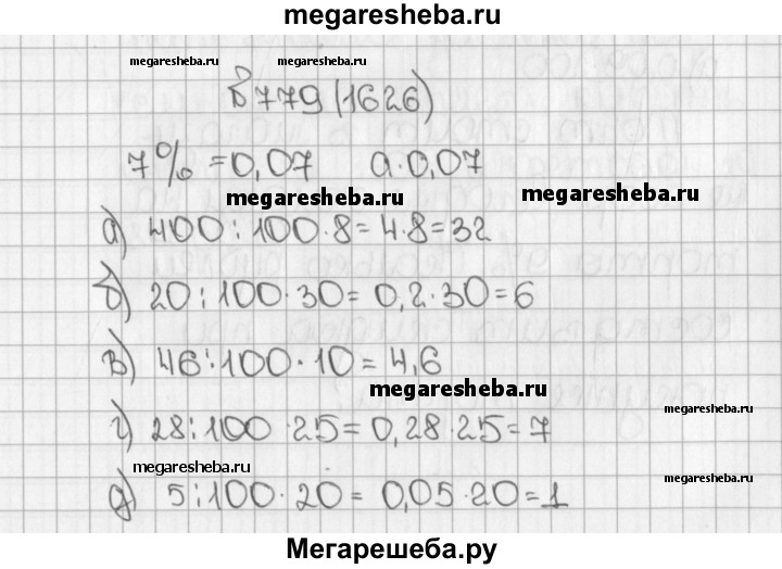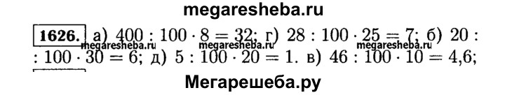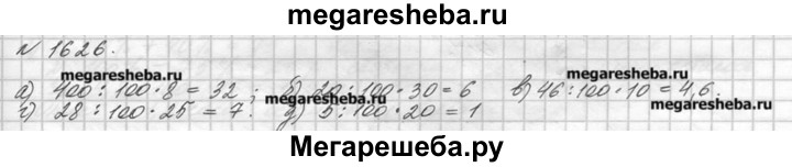 1626. Расскажите, как найти 7% числа а. Найдите: а) 8% от 400; г) 25% от 28; б) 30% от 20; д) 20% от 5. в) 10% от 46;