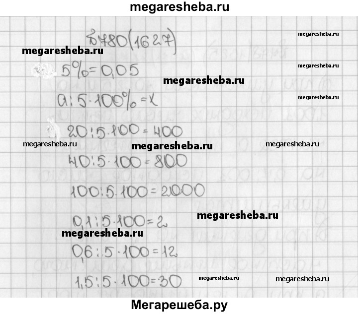 1627. Найдите число, если 5% этого числа равны: 20; 40; 100; 0,1; 0,6; 1,5.