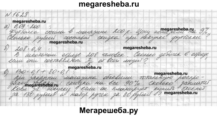 1628. Составьте задачу по числовому выражению: а) 0,09 * 200; б) 208 * 0,4; в) 130 * 0,1 + 80 * 0,1.