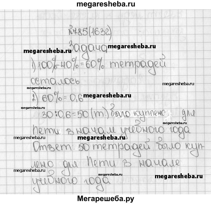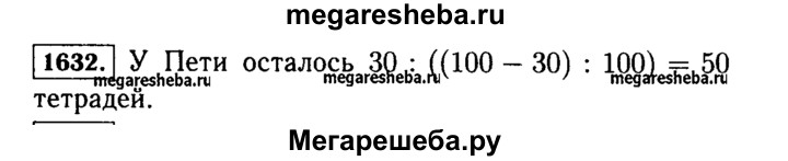 1632. За учебный год Петя израсходовал 40% купленных в начале года тетрадей, и у него осталось 30 тетрадей. Сколько тетрадей было куплено для Пети в начале учебного года?