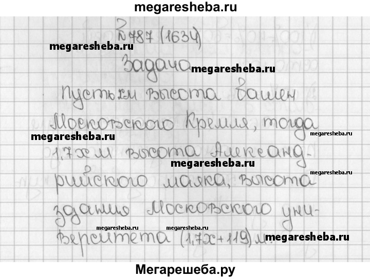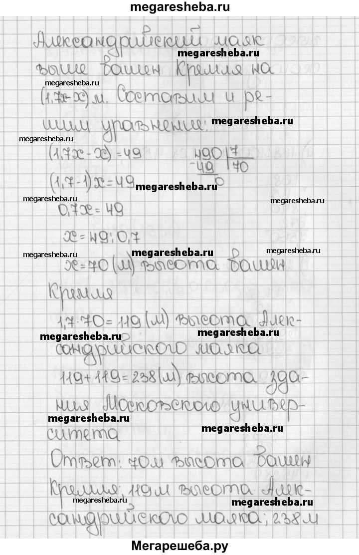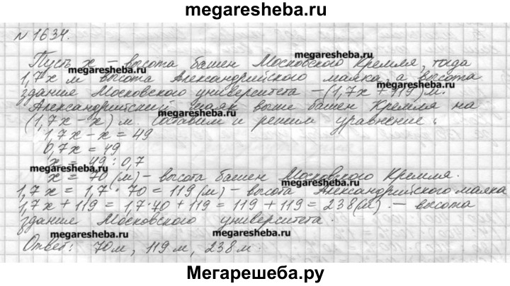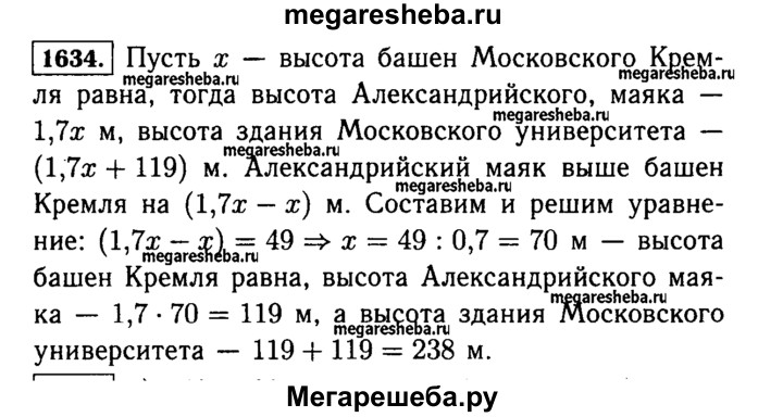 1634. Построенный в древности Александрийский маяк, который называли одним из семи чудес света, выше башен Московского Кремля в 1,7 раза, но ниже здания Московского университета на 119 м. Найдите высоту каждого из этих сооружений, если башни Московского Кремля на 49 м ниже Александрийского маяка.