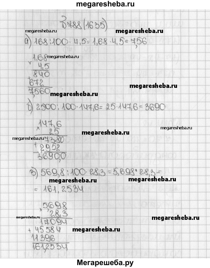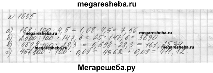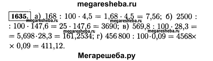 1635. Найдите с помощью микрокалькулятора: а) 4,5% от 168; в) 28,3% от 569,8; б) 147,6% от 2500; г) 0,09% от 456 800.