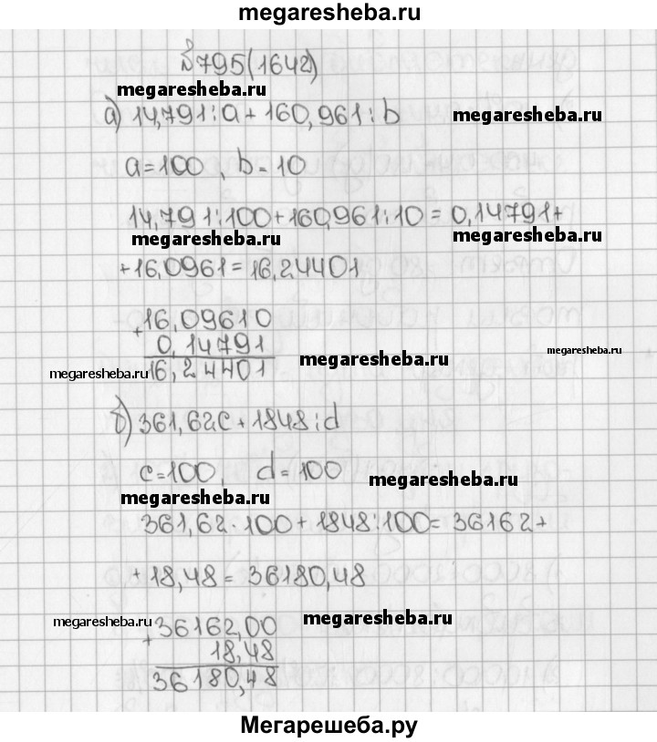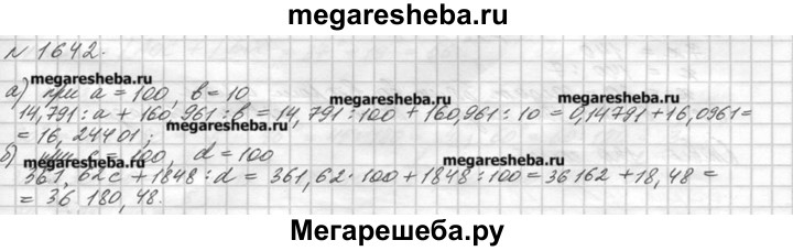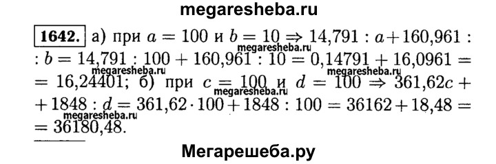 1642. Найдите значение выражения: а) 14,791 : а + 160,961 : b, если а = 100, b = 10; б) 361,62с + 1848 : d, если с = 100, d =100.