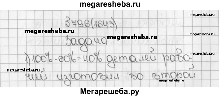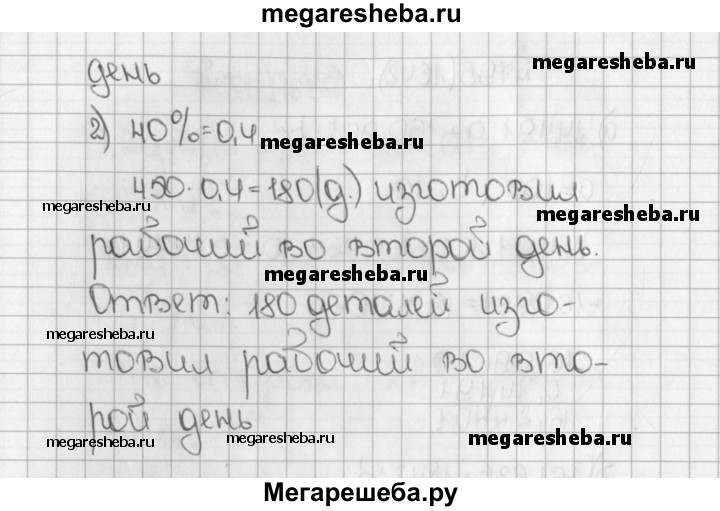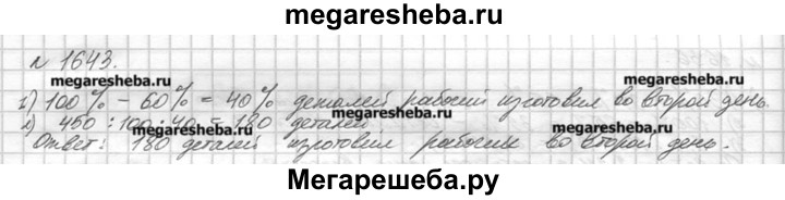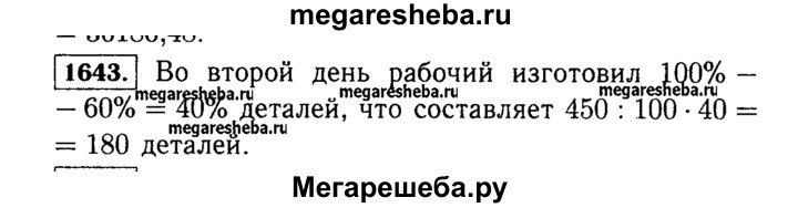 1643. Рабочий должен был изготовить 450 деталей. В первый день он изготовил 60% деталей, а остальные — во второй. Сколько деталей изготовил рабочий во второй день?