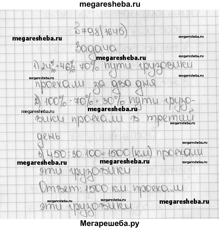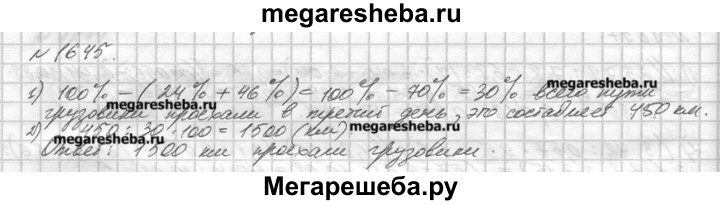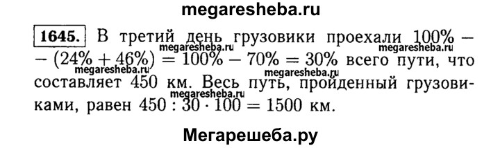 1645. Грузовики в первый день проехали 24% намеченного пути, во второй день — 46% пути, а в третий — остальные 450 км. Сколько километров проехали эти грузовики?