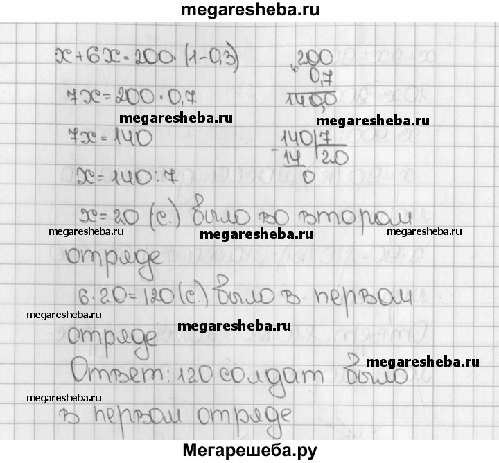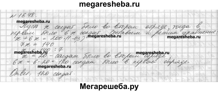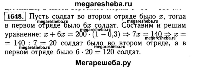 1648. Во время манёвров командир оставил 0,3 всех своих солдат охранять переправу, а остальных разделил на 2 отряда для обороны двух высот. В первом отряде было в 6 раз больше солдат, чем во втором. Сколько солдат было в первом отряде, если всего было 200 солдат?
