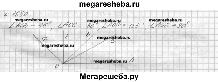 1650. Начертите луч OA. С помощью транспортира по одну сторону от луча OA постройте: ZAOB = 45°, ZAOC = 30°, ZAOD = 135°, ZAOE = 90°.
