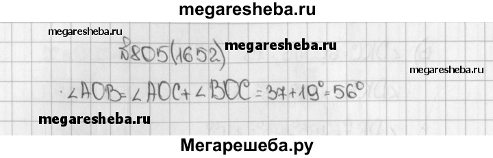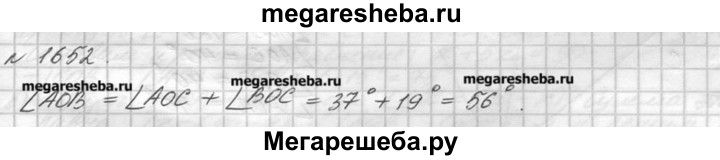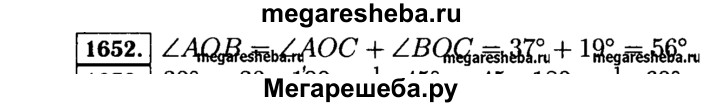 1652. Луч ОС лежит внутри угла АОВ, причём ZAOC = 37°, ZBOC = = 19°. Чему равен угол АОВ?