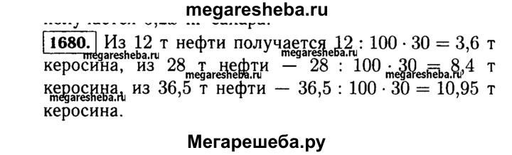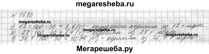 1680. При перегонке нефти получается 30% керосина. Сколько керосина можно получить из 12 т; из 28 т; из 36,5 т нефти?