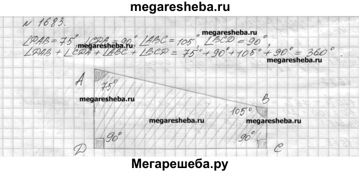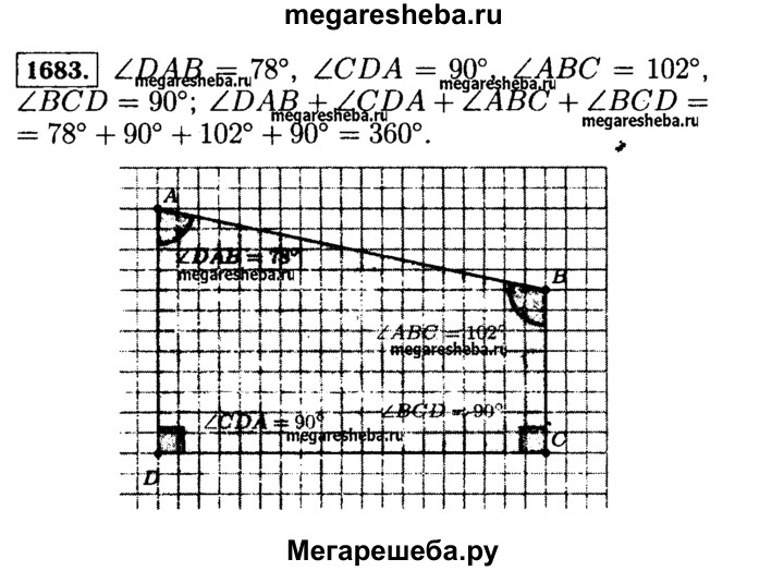 1683. Начертите произвольный четырёхугольник ABCD, измерьте транспортиром его углы и сложите результаты измерений.