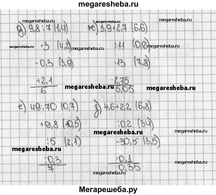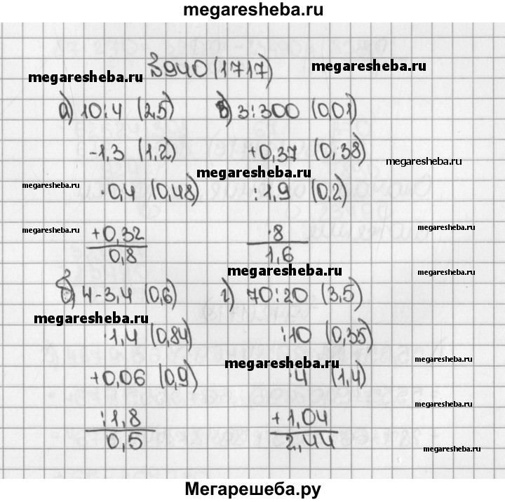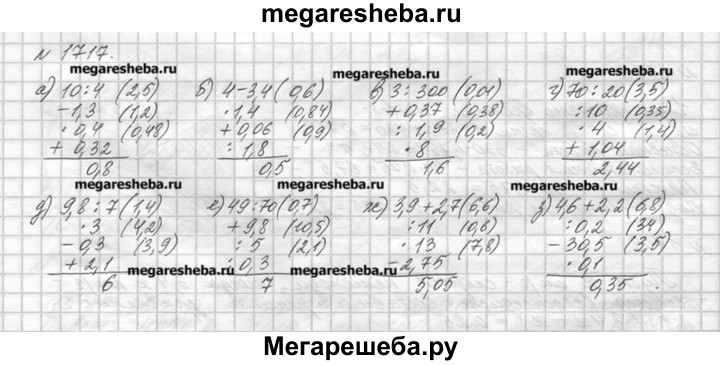 1717. Вычислите устно: а)10 : 4 - 1,3 * 0,4 + 0,32/? в)3 : 300 + 0,37 : 1,9 * 8/? д) 9,8 : 7* 3 - 0,3 + 2,1/? ж) 3,9 + 2,7 : 11 * 13 - 2,75/? б)4 - 3,4 * 1,4 + 0,06 : 1,8/? г) 70: 20 : 10 * 4 1,04/? е) 49 : 70 + 9,8 : 5 : 0,3/? з) 4,6 + 2,2 : 0,2 - 30,5 *0,1/?