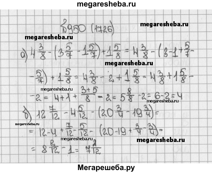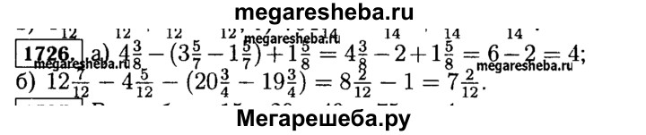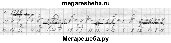 1726. Выполните действия: a)4*3/8 – ( 3*5/7 – 1* 5/7) + 1*5/8; б)12*7/12 – 4*5/12 – ( 20*3/4 – 19*3/4).