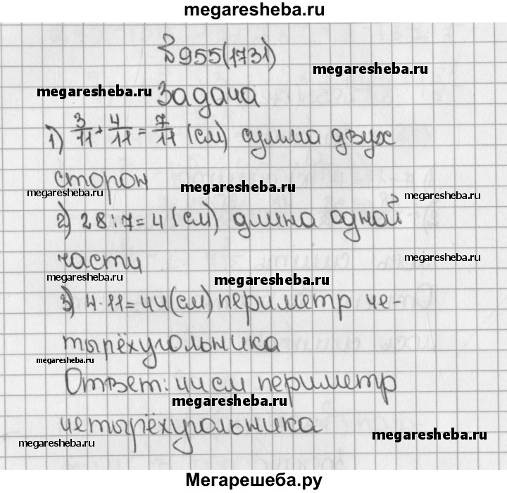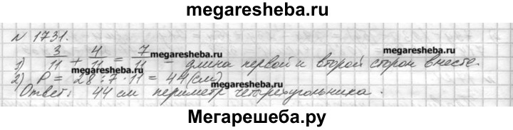 1731. Длина одной стороны четырёхугольника составляет 3/11 его периметра, длина другой 4/11 периметра, а сумма длин этих сторон равна 28 см. Найдите периметр четырёхугольника.