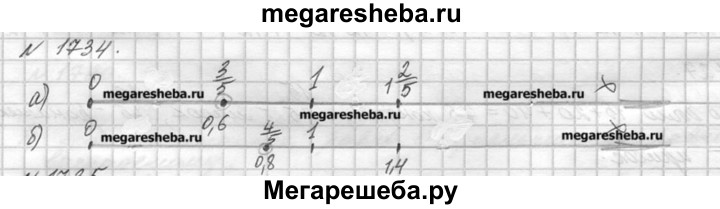 1734. Приняв за единичный отрезок длину 10 клеток тетради, отметьте на луче точки, координаты которых равны: а) 0; 1; 0,3; 3/5 ; 0,6; 1*2/5 ; 1,2; б) 0; 1; 0,2; 4/5; 0,8; 1*3/5; 1,4.