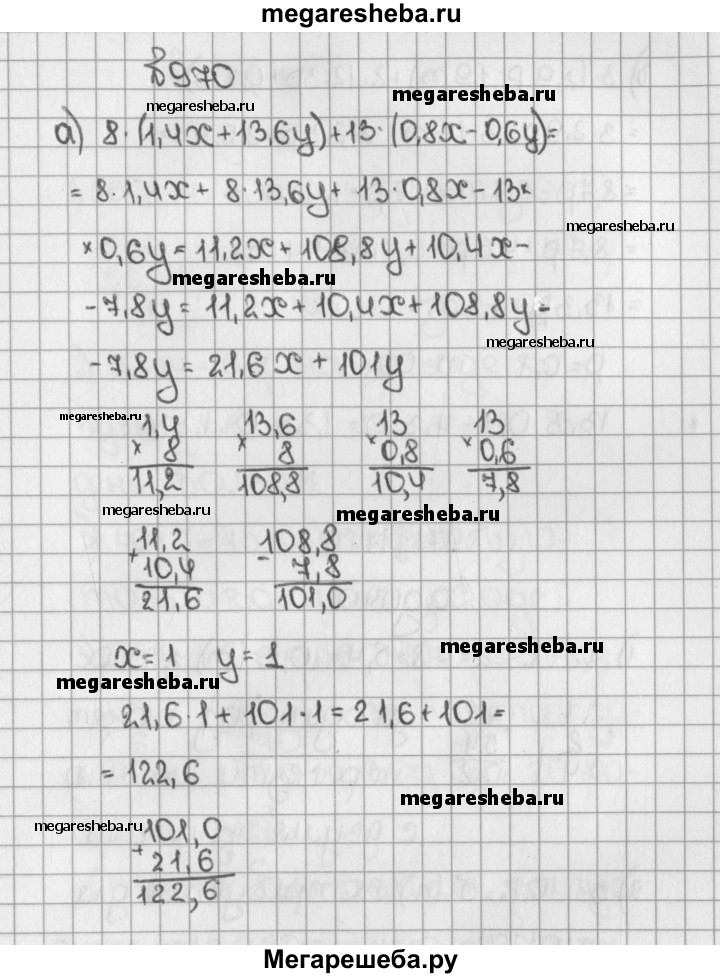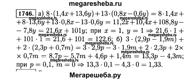 1746. Найдите значение выражения: а) 8 * (1,4х + 13,6у) + 13 * (0,8x - 0,6y) при х = 1; у = 1; б) 3 * (2,9р - 1,9m) + 2 * (2,3р + 0,7m) при р = 0,1; m = 0.