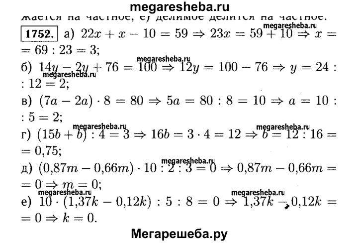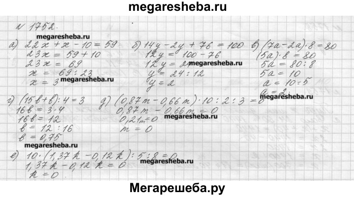1752. Решите уравнение: а) 22х + х - 10 = 59; г) (15Ь + b) : 4 = 3; б) 14у - 2у + 76 = 100; д) (0,87m - 0,66m) * 10 : 2 : 3 = 0; в) (7а - 2а) * 8 = 80; е) 10 * (1,37k - 0,12k) : 5 : 8 = 0.