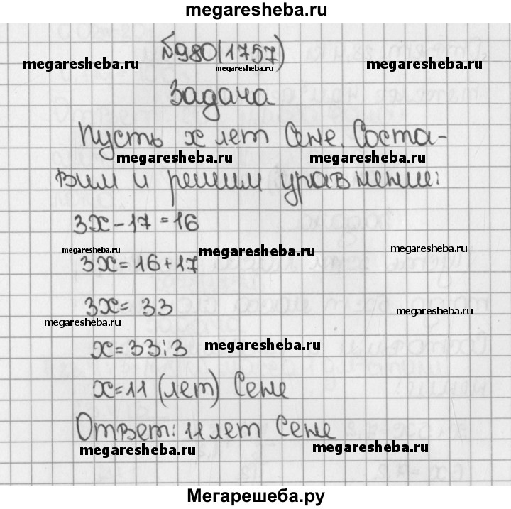 1757. Саша спросил Сеню: «Сколько тебе лет?» Сеня ответил: «Если число моих лет увеличить в 3 раза, а потом уменьшить на 17, то получится 16 лет». Сколько лет Сене?