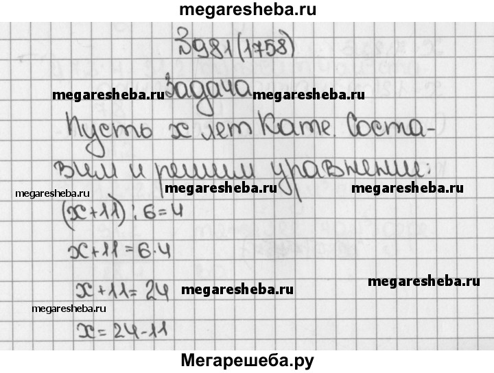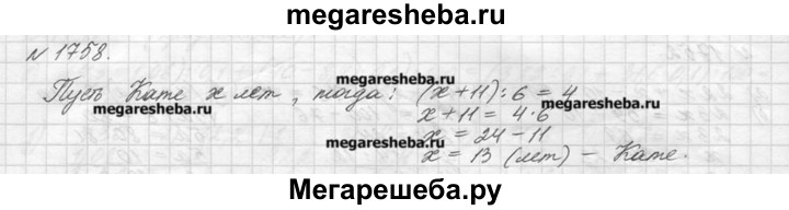 1758. Если число лет Кати увеличить на 11 и полученный результат уменьшить в 6 раз, то будет 4. Сколько лет Кате?