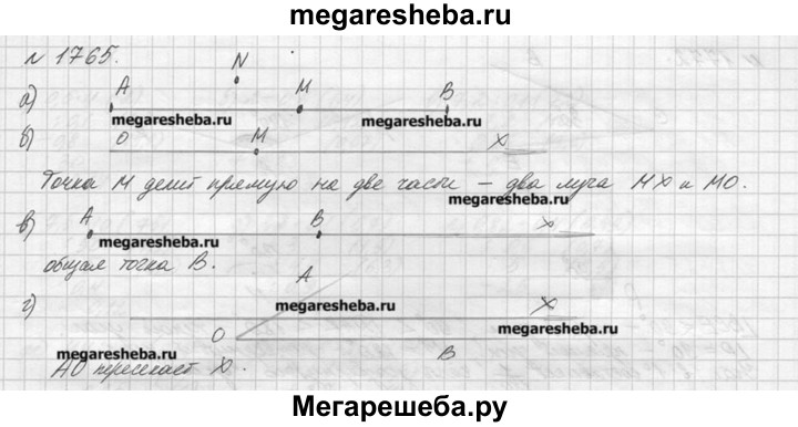 1765. Выполните рисунки: а) начертите отрезок и отметьте точку, лежащую на отрезке, и точку, не лежащую на нём; б) начертите прямую и отметьте на ней точку М; ответьте, как называются части, на которые точка М делит прямую; в) начертите отрезок и луч так, чтобы они не пересекались; чтобы отрезок лежал на луче; чтобы отрезок и луч имели одну общую точку; г) начертите угол и прямую так, чтобы прямая пересекала только одну сторону угла.