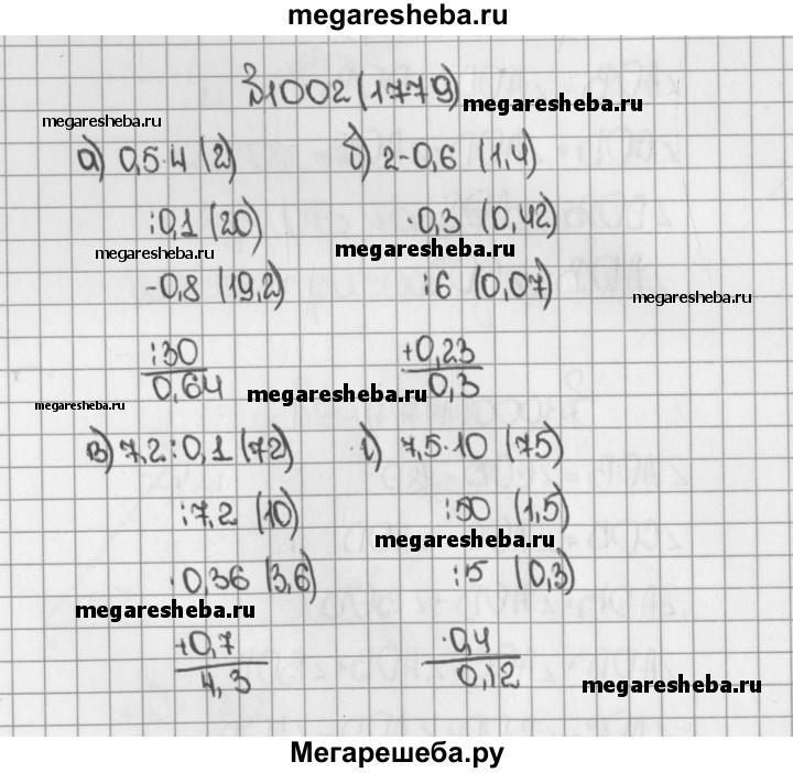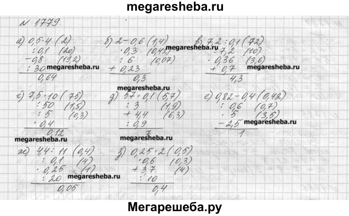 1779. Вычислите устно: а) 0,5 * 4: 0,1 - 0,8: 30/? в) 7,2 : 0,1: 7,2* 0,36+ 0,7/? д) 57 * 0,1: 3+ 4,4: 0,9/? ж) 4,4 : 11: 0,1* 0,25: 20/? б)2 - 0,6* 0,3: 6+ 0,23/? г) 7,5 * 10: 50: 5* 0,4/? е) 0,82 - 0,4 : 0,6-5- 2,5/? з) 0,25 * 2* 0,6+3,7: 10/?