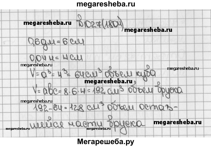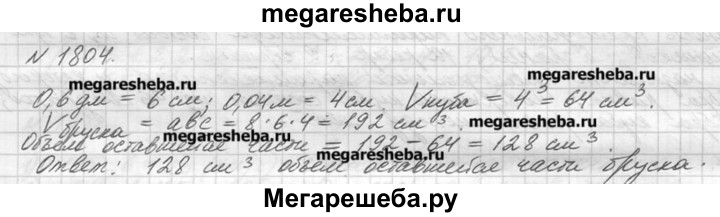 1804. Из деревянного бруска, длина которого 8 см, ширина 0,6 дм и высота 4 см, вырезали куб с ребром 0,04 м. Чему равен объём оставшейся части бруска?