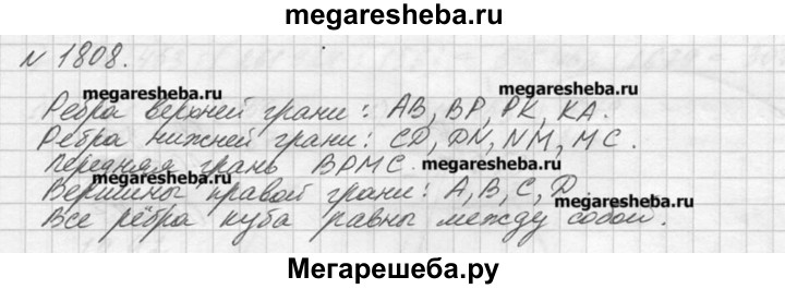 1808. На рисунке 198 изображён куб. Назовите рёбра верхней и нижней граней, переднюю грань, вершины правой грани, равные рёбра.