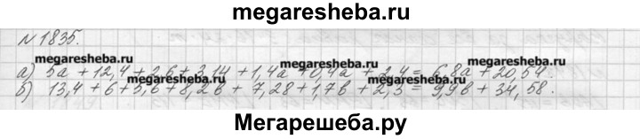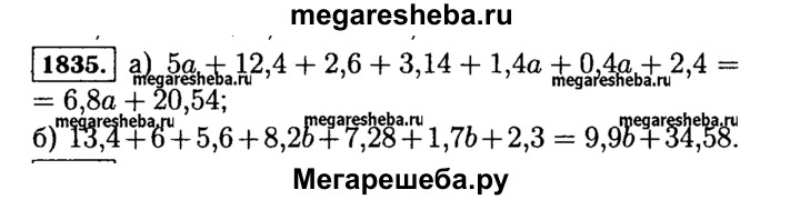 1835. Упростите выражение: а) 5а + 12,4 + 2,6 + 3,14 +1,4а + 0,4а + 2,4; б) 13,4 + 6 + 5,6 + 8,2b + 7,28 + 1,7 Ь + 2,3.