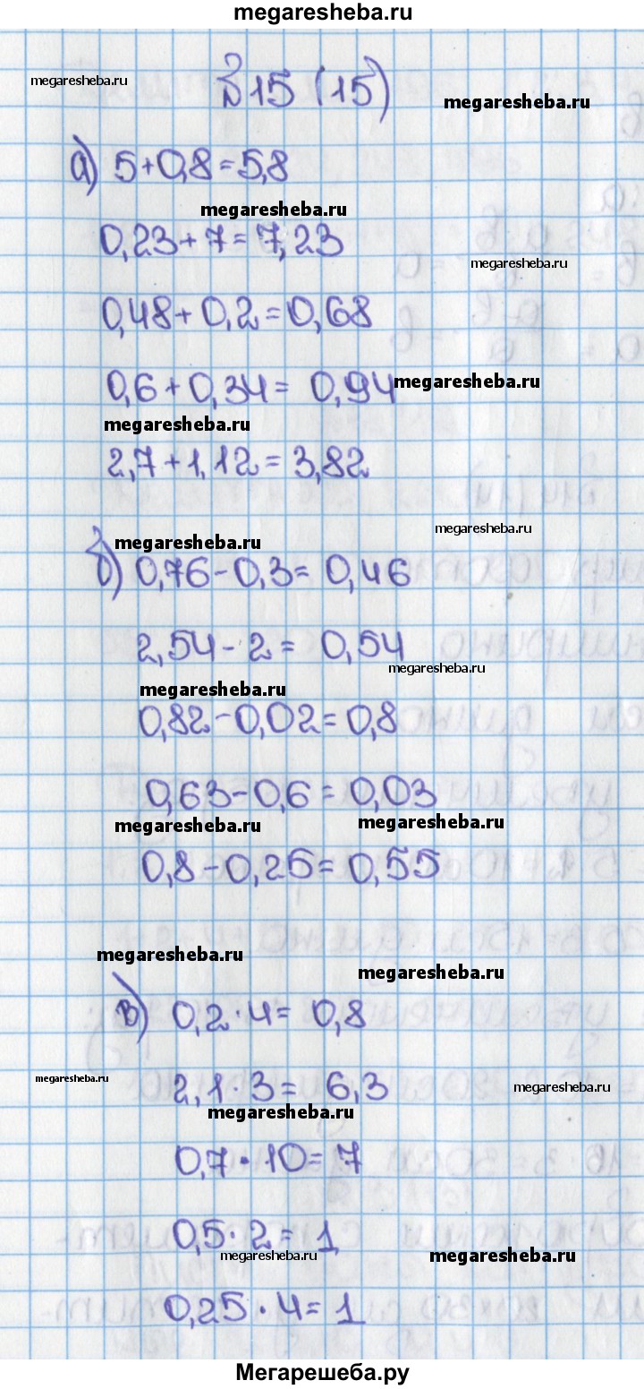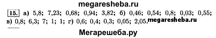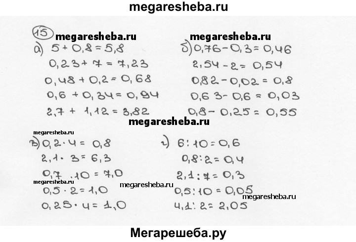 15. Вычислите устно: а) 5 + 0,8; 0,23 + 7; 0,48 + 0,2; 0,6 + 0,34; 2,7 + 1,12; б) 0,76 - 0,3; 2,54 - 2; 0,82 - 0,02; 0,63 -0,6; 0,8 - 0,25; в) 0,2 * 4; 2,1 * 3; 0,7 * 10; 0,5 * 2; 0,25 * 4; г) 6 : 10; 0,8 : 2; 2,1 : 7; 0,5 : 10; 4,1 : 2.
