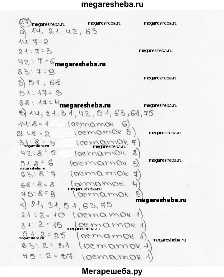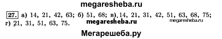 27. Выберите из чисел 14, 21, 31, 42, 51, 63, 68, 75 те, которые: а) кратны 7; б) кратны 17; в) не кратны 8; г) не кратны 2.