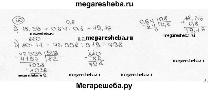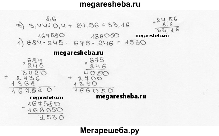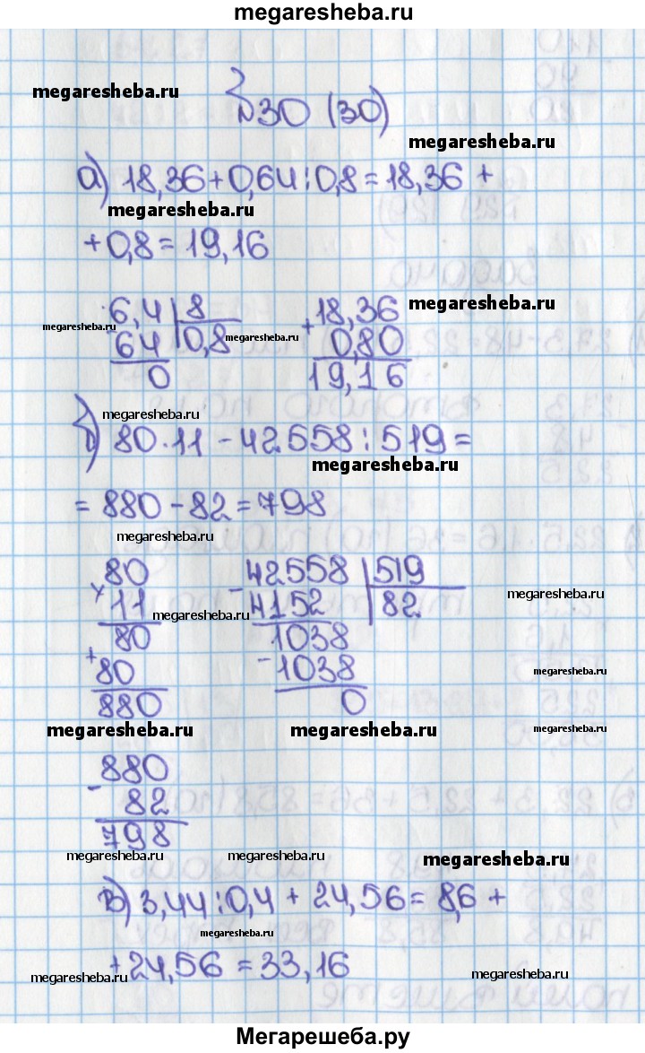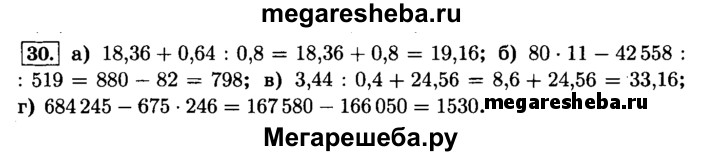 30. Выполните действия: а) 18,36 + 0,64 : 0,8; б) 80 * 11 - 42 558 : 519; в) 3,44 : 0,4 + 24,56; г) 684 * 245 - 675 * 246.