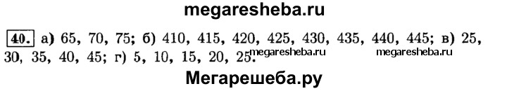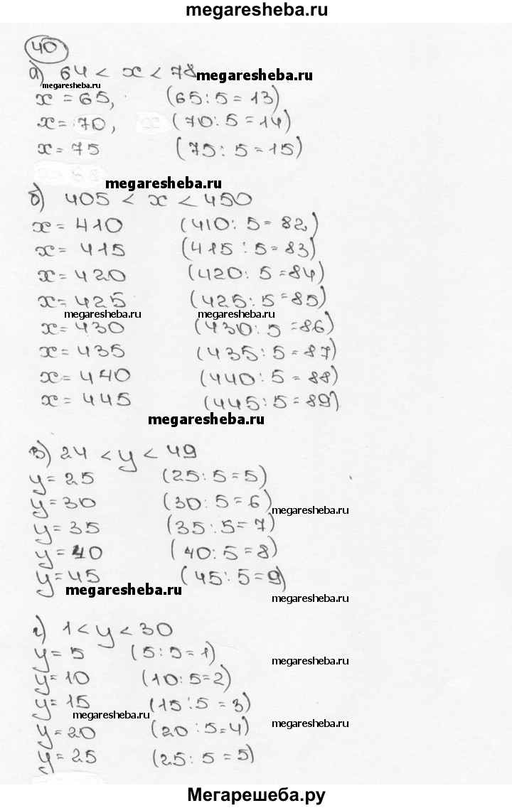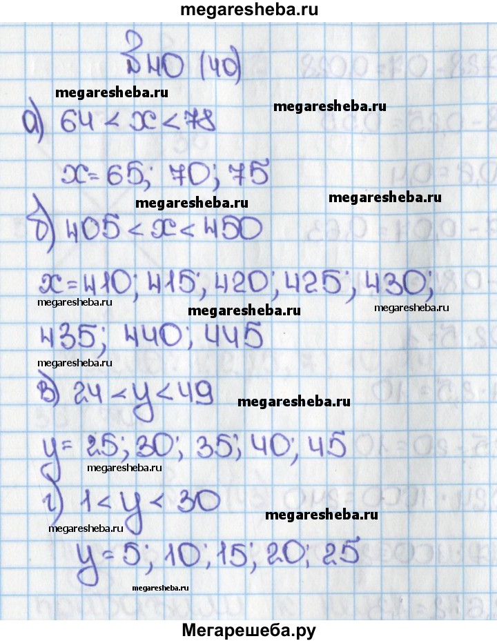 40. Какие числа, кратные 5, удовлетворяют неравенству: а) 64 < x < 78; б) 405 < х < 450; в) 24 < у < 49; г) 1 < у < 30?