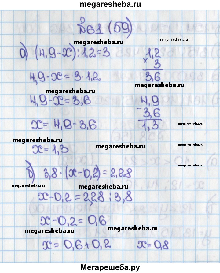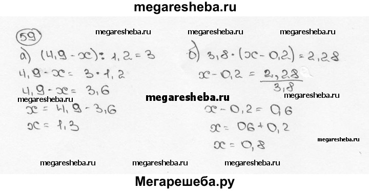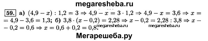 59. Решите уравнение: а) (4,9 - х) : 1,2 = 3; б) 3,8 * (х - 0,2) = 2,28.