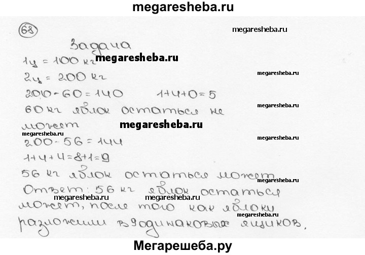 68. Собрали 2 ц яблок и часть из них разложили в 9 одинаковых ящиков. Могло ли после этого остаться: 60 кг яблок? 56 кг яблок?