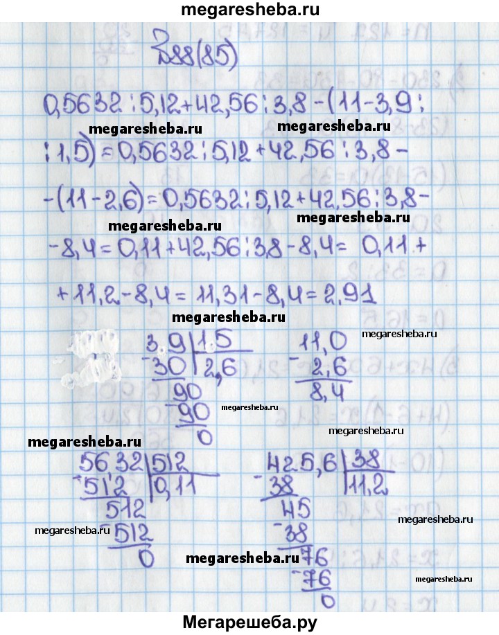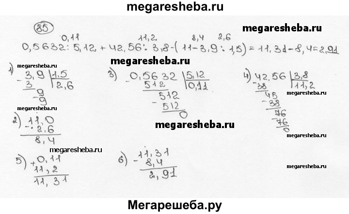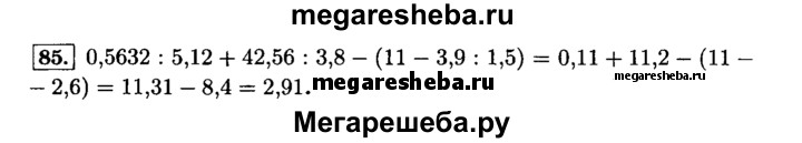 85. Вычислите: 0,5632 : 5,12 + 42,56 : 3,8 - (11 - 3,9 : 1,5). Вычисления проверьте с помощью микрокалькулятора.