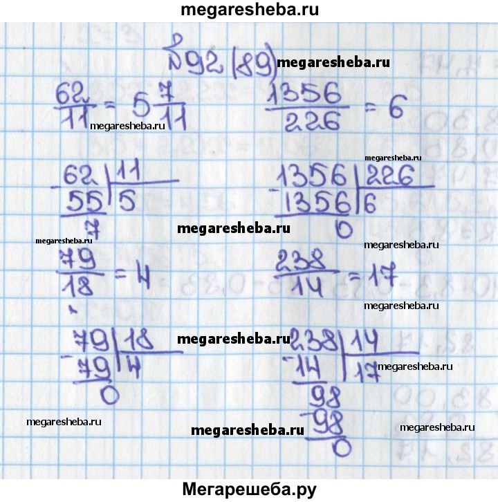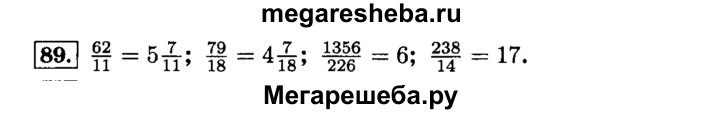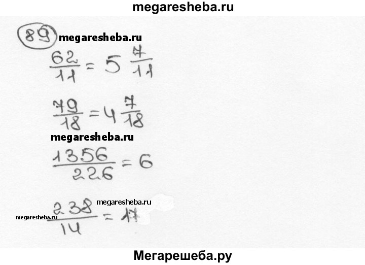 89. Исключите целую часть из чисел: 62/11, 79/18, 1356/226, 238/14.