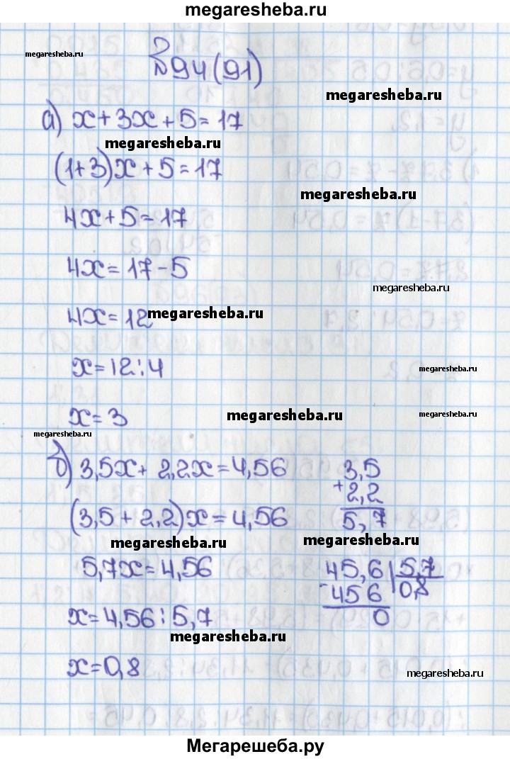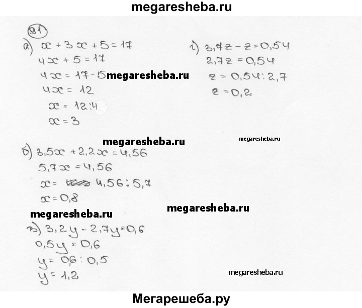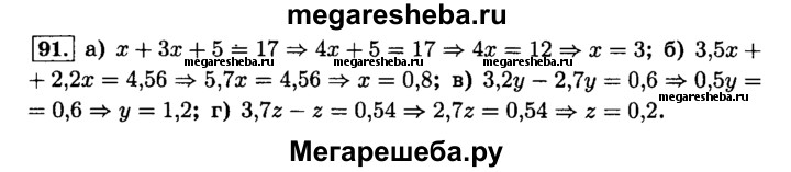 91. Решите уравнение: а) x + Зх + 5 = 17; б) 3,5x + 2,2x = 4,56; в) 3,2у - 2,7у = 0,6; г) 3,7z - z = 0,54.