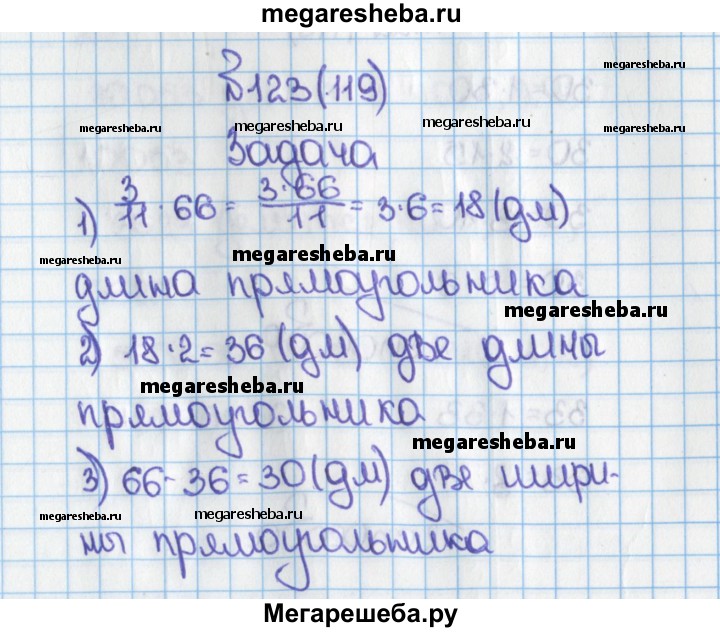 119. Периметр прямоугольника 66 дм. Длина одной его стороны составляет 3/11 периметра. Найдите площадь прямоугольника.