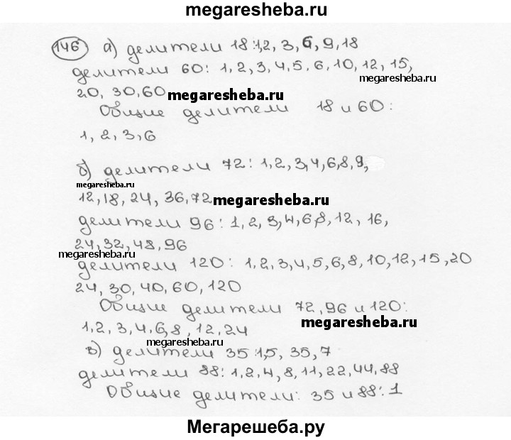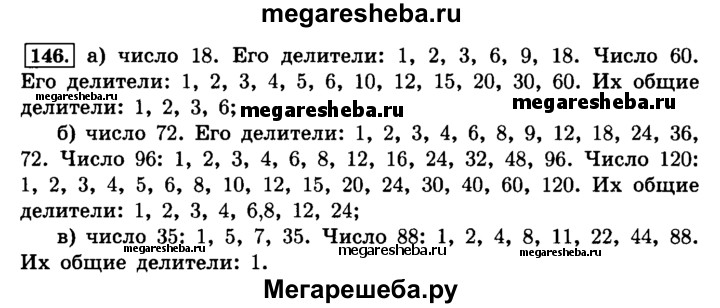 146. Найдите все общие делители чисел: а) 18 и 60; б) 72, 96 и 120; в) 35 и 88.
