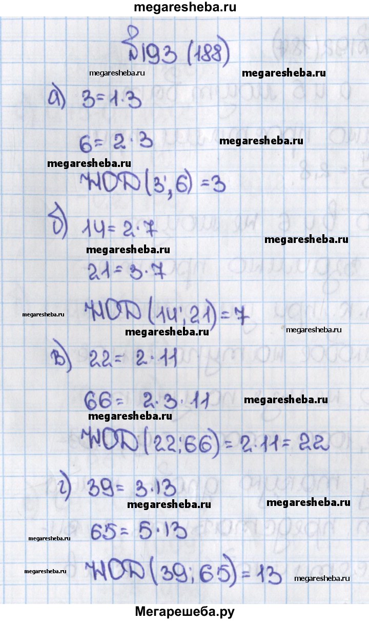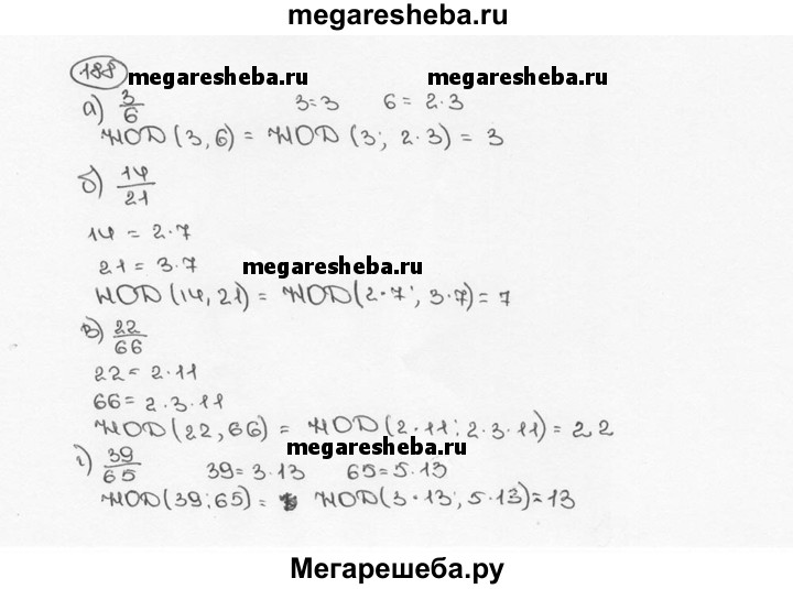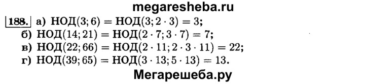 188. Найдите наибольший общий делитель для числителя и знаменателя дроби: а) 3/6; б) 14/21; в) 22/66; г) 39/65.