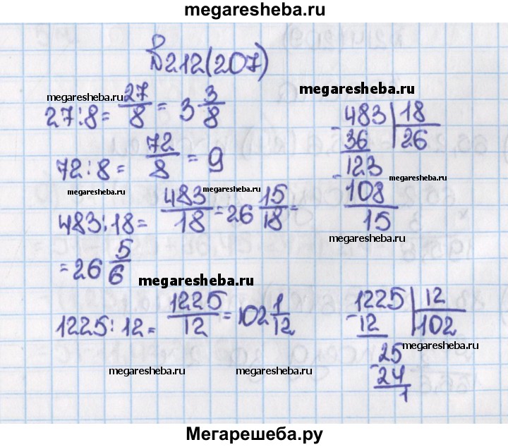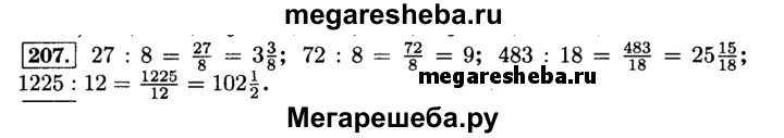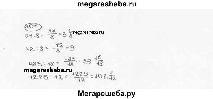 207. Запишите в виде дроби частные 27 : 8; 72 : 8; 483 : 18; 1225 : 12 и выделите из них целые части.