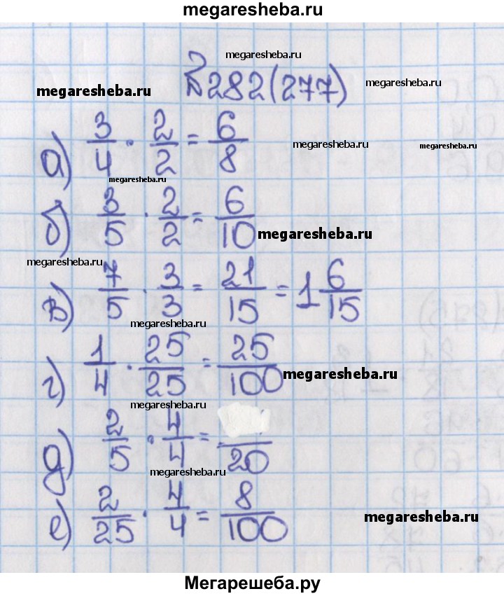 277. Сколько содержится: а) восьмых в 3/4; б) десятых в 3/5; в) пятнадцатых в 7/5; г) сотых в 1/4; д) двадцатых в 2/5; е) сотых в 2/25?